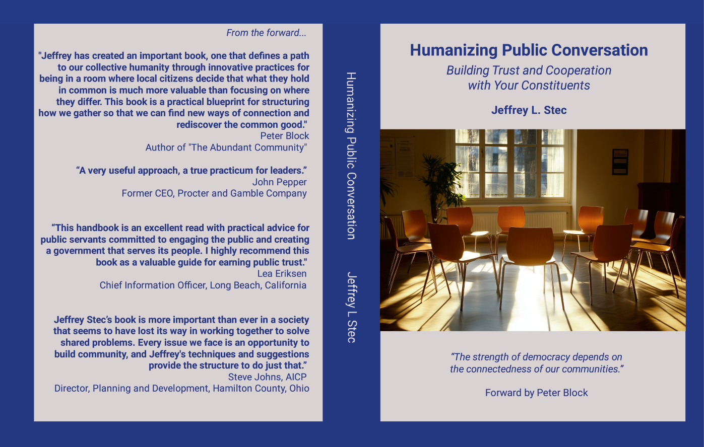 Katherine Keough-Jurs, FAICP, Directory of Planning and Engagement, City of Cincinnati “Humanizing Public Conversation is a significant contribution to illustrating how citizens can share their concerns and influence decisions about issues that confront them in their communities. Jeffrey Stec provides many concrete examples of how this can be done. Community engagement of this sort is very important in efforts to strengthen our democratic system. PURCHASE THIS BOOK AND READ IT!”